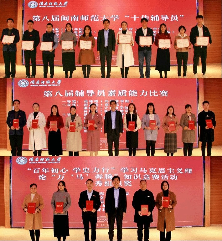 会议同时还举行了2021年学生工作表彰仪式,对第八届闽南师范大学“十佳辅导员”、第八届辅导员素质能力比赛获奖者、2021年思想政治工作精品项目重点项目和一般项目、2021年辅导员工作精品项目及“百年初心 学史力行”学习马克思主义理论“万‘马’奔腾”知识竞赛活动优秀组织奖进行表彰。钟发亮分别为获奖单位和个人颁奖。