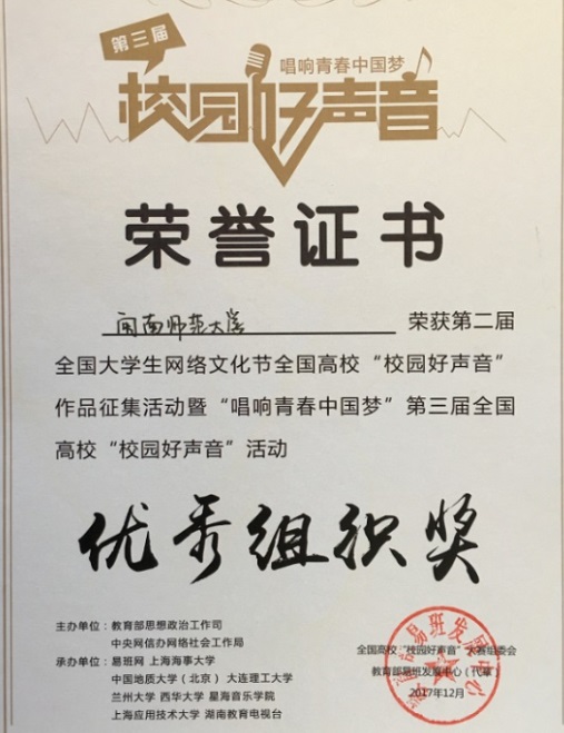 由教育部思想政治工作司、中央网信办网络社会工作局主办,易班网和上海海事大学承办的第三届全国高校“校园好声音”比赛结果日前揭晓,我校被评为优秀组织单位,学工部吴主敏教师荣获“优秀指导教师奖”。