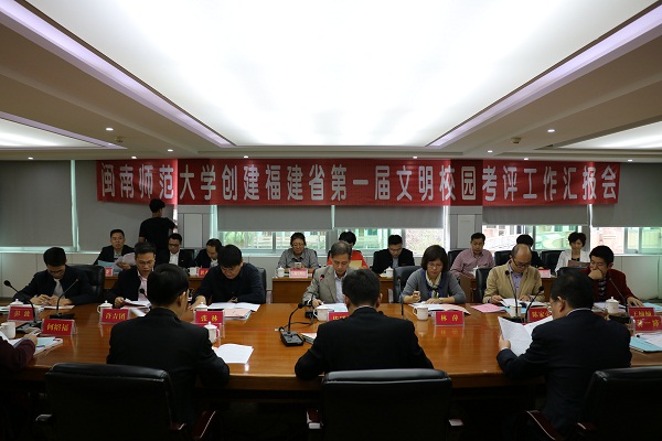 受省委教育工委委托,11月20日上午,以华侨大学党委副书记、纪委书记毕明强为组长的福建省第一届文明校园考评组一行7人莅临我校,对我校创建文明校园工作进行实地考评。考评汇报会在逸夫楼三楼会议中心举行。考评专家组成员,我校党委书记吴彬镪、校长李顺兴,副校长肖庆伟、何绍福、蒋一婷出席汇报会,我校相关职能部处负责人参加汇报会。