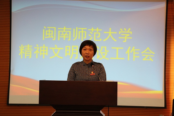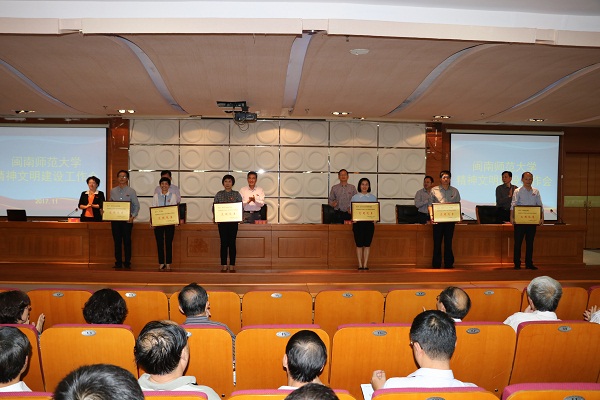 蒋一婷副校长还宣读了《中共闽南师范大学委员会关于表彰2015-2017年文明院系、文明处室、文明个人的决定》。经校党委研究,授予数学与统计学院等6个单位为“2015-2017年文明院系”,授予党(校)办等16个单位为“2015-2017年文明处室”,授予李富荣等40名同志为“2015-2017年文明个人”。数学与统计学院党委副书记陈晶莹还作为文明院(系)代表在会上发言,介绍了学院精神文明建设的经验做法。
