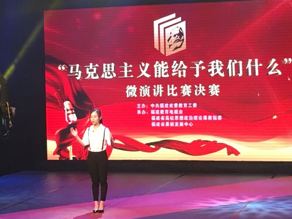 11月3日,由福建省委教育工委主办的“马克思主义能够给予我们什么”微演讲决赛在福建教育电视台演播厅举行。决赛分研究生组、本科生组、高职高专组,来自全省各高校的30名学子同台竞技。我校外国语学院本科生廖超颖和马克思主义学院研究生李新航参加比赛,均获得了三等奖。加上在优秀演讲稿比赛中获得的1个二等奖、4个三等奖和2个优秀奖,我校学子共在此项赛事中获得了9个奖项,为学校赢得了荣誉。