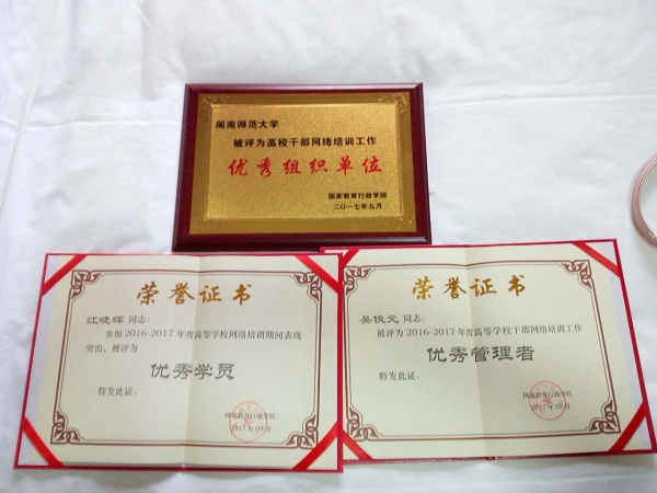会议对在2016-2017年度中国教育干部网络学院高等教育干部网络培训中表现突出的66所高校、68位管理者和21名学员给予表彰。近年来,我校不断强化党员干部培训工作,在干部网络培训工作中再创佳绩,连续两年被评为“高校干部网络培训工作优秀组织单位”。组织部组织员吴俊元被评为“2016-2017年度高等学校干部网络培训工作优秀管理者”,马克思主义学院教师江晓晖在参加2016-2017年度高等学校干部网络培训中表现突出被评为“优秀学员”。