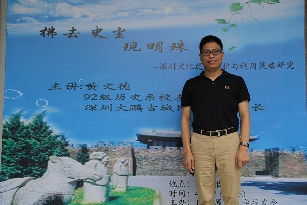 黄文德,我校92级历史系校友。毕业后分配到东山二中从事本专业的历史学科教学。1997年,南下深圳,开始从事文化遗产保护与应用策略研究至今。现任闽南师范大学粤港澳校友会副会长、深圳大鹏古城博物馆副馆长,深圳市大鹏新区文物管理办公室主任、中国科学技术史学会建筑史专业委员会学术委员、深圳市龙岗区政协委员。