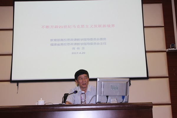 授牌仪式结束后,郑传芳教授还为在场师生作了题为《不断开辟21世纪马克思主义发展新境界》的专题讲座。郑传芳教授围绕“十八大以来习近平总书记对坚持和发展马克思主义的一系列重要阐述”、“习近平总书记系列重要讲话是当代中国马克思主义最新发展”、“思政课课程教学环节中的贯彻”和“加强高校马克思主义学院建设”等方面深入阐释了马克思主义发展的新境界。报告主题鲜明,内涵丰富,既有理论深度,又紧密联系实际,深入浅出,娓娓道来,对我校师生全面正确理解和把握马克思主义理论,领会中央、省委有关精神,增强“四个自信”,树立“四个意识”,加强马克思主义理论研究和教学具有较强的现实指导意义。