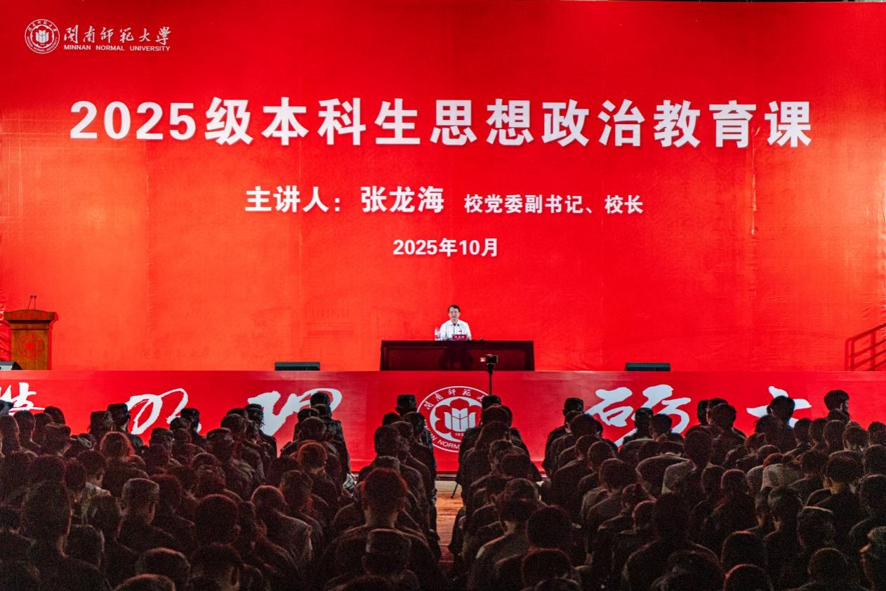 10月13日晚,校党委副书记、校长张龙海讲授题为《以“同球共济”精神推动构建人类命运共同体》的思想政治教育课,参加江滨校区军训的全体本科生现场聆听。