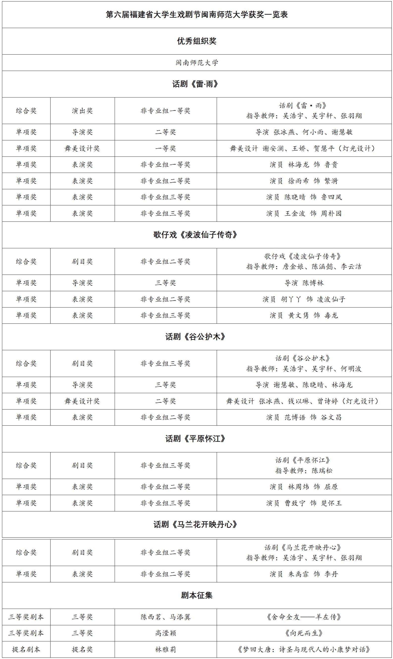 近日,第六届福建省大学生戏剧节评奖结果揭晓,我校选送的作品共斩获综合奖5个,单项奖15个,剧本征集奖3个,我校荣获优秀组织奖,基本涵盖所有奖项类别,获奖数量居全省参赛高校前列。