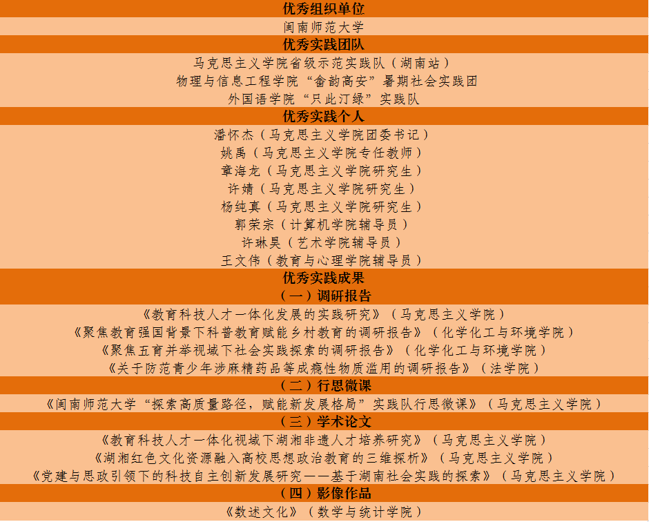 近日,中共福建省委教育工委公布“追寻领袖足迹 担当强国使命”2025年全省大学生暑期社会实践活动评选结果。我校在本次评选中共斩获21项省级荣誉,其中优秀组织单位1个、优秀实践团队3个、优秀实践个人8名、优秀实践成果9项,获奖数量和质量均创历史新高。