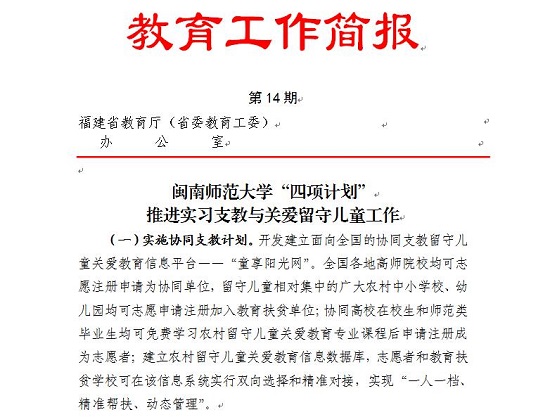 近日,省教育厅《教育工作简报》2016年第14期刊发我校“四项计划”推进实习支教与关爱留守儿童工作。