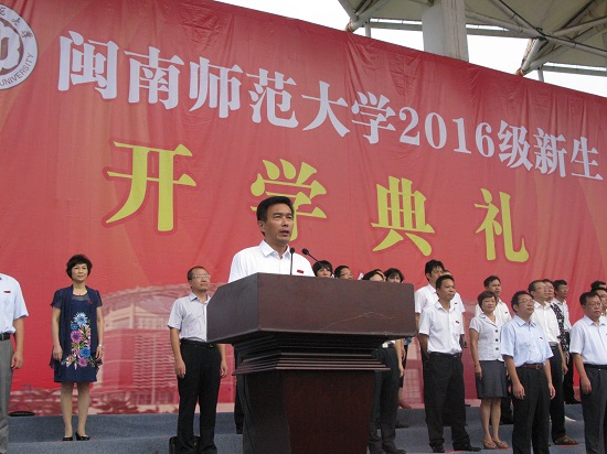 9月11日上午,我校在西区田径场隆重举行2016级新生开学典礼,喜迎4900多名来自全国各地的莘莘学子。校党委书记林晓峰、校长李进金、党委副书记吴彬镪、副校长肖庆伟、李顺兴、何绍福、蒋一婷、校长助理林静华等校领导出席典礼,全校各机关、教辅单位主要负责人,各教学单位党、政主要负责人,全体政工干部,各学院教师代表和部分新生家长参加了典礼。开学典礼由吴彬镪副书记主持。