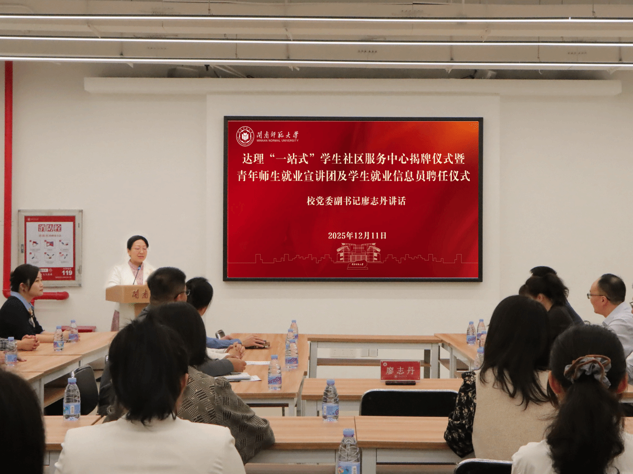 廖志丹在仪式上致辞。她指出,“一站式”学生社区综合管理模式建设是一项系统工程,既是高校育人模式改革迭代的“小切口”,也是新时代、新学情、新场景下“立德树人工程”的大课题。她要求有关部门要结合新时代学校“温暖集体”建设,将“一站式”学生社区建设成为爱心工程、民心工程。要精心布局,通过各部门协同联动、共同布局,从顶层设计出发,让社区建设体现更多“温暖”元素;要抓好开局,把优势充分集合、把资源迅速集中,让学生获得更多的便捷体验,构建独具闽南师大特色的育人文化符号与生态。要重点破局,聚焦学生高频需求和痛点问题,集成学业咨询、事务办理、心理辅导、就业指导等关键服务,使其真正发挥出“塑形”“绘境”“育心”等应有效能。