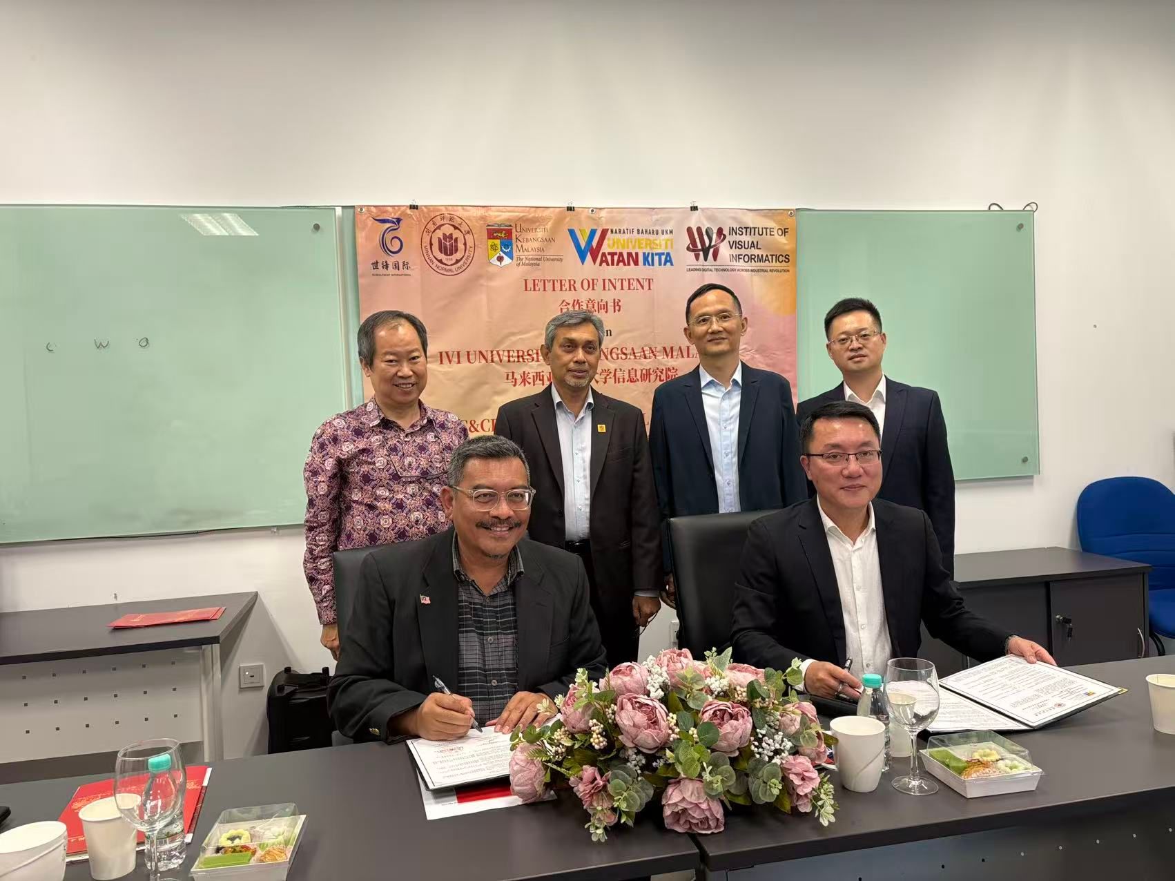 揭牌仪式前,我校海外教育学院与马来西亚国立大学视觉信息研究院负责人分别代表双方签署中心共建协议。我校物理与信息工程学院负责人、马来西亚国立大学视觉信息研究院与商学院科研团队成员参加上述活动。