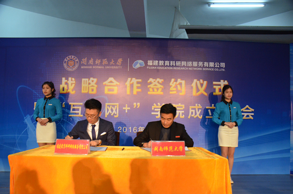 成立会上,我校正式与福建教育科研网络服务有限公司签订了《校企战略合作框架协议》。根据协议,双方将共同建设项目合作平台——闽南师范大学“互联网+”学院,在创新创业人才培养、创业实践基地建设、产学研用合作、服务地方产业发展等方面开展深入合作。
