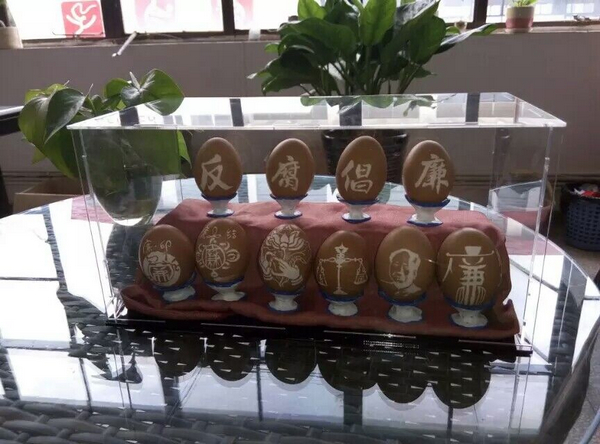 整套作品以“反腐倡廉”为主题,紧扣一个“廉”字。上排四个蛋壳正面刻有“反腐倡廉”四个显赫的大字,后面则是“梅、兰、竹、菊”四君子图,寓意为官清廉者必须恪守“四君子”的精神,不被世俗吸引,而迷失本性。下方6个蛋壳则分别寓意为官者应:“手持廉印,心系廉结,心如莲洁,公平公正,敬仰领袖,为官清廉”从多个方面深刻阐述了“廉”的重要意义,倡导“廉政为民”。