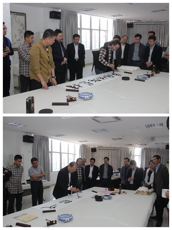 双方代表分别致辞。广东技术师范学院美术学院副院长靳继君教授为笔会开笔。而后,双方书画艺术家现场挥毫,撰写书法及描绘国画,互相交流切磋探讨。