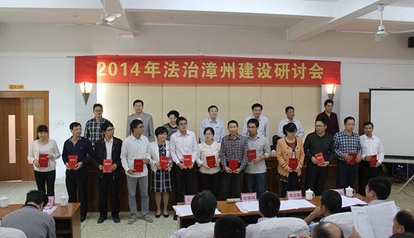 会议表彰2014年“法治漳州”建设研讨会入选论文作者。漳州市中级人民法院课题组代表江团辉,龙文区人民检察院课题组代表唐淑珍,芗城区人民检察院侦查督导科检察员谢艳珊,南靖县人民法院党组成员、纪检组长郑丰城,金峰开发区管委会党政办科员陈智兴,龙文区公安分局指挥中心科员刘晓青,漳浦县人民检察院检察长林文井,东山县人民政府法制办副主任林晓彬等8位论文作者代表在会上作交流发言。