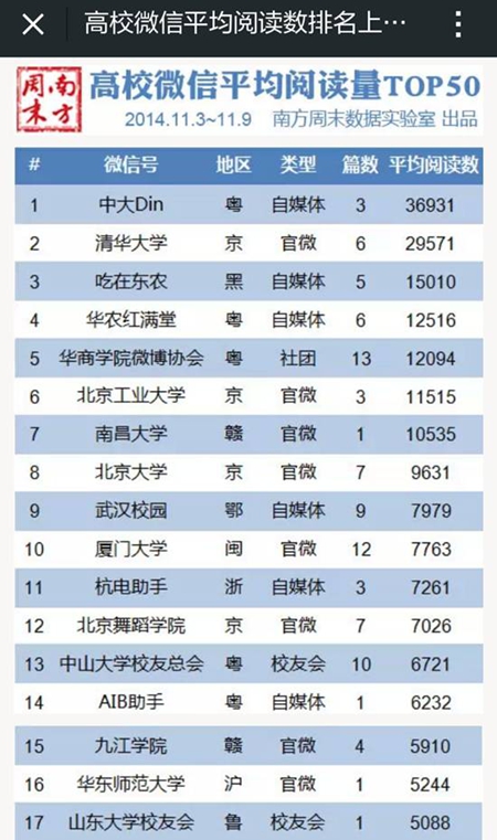 继我校官方微信平台名列该期全国高校官方微信影响力周榜第30名,福建省高校排名第3后。近日,南方周末数据实验室出品的“中国高校微信排行榜”(11.03—11.09)榜单发布。校团委微信公众号“闽南师范大学团委”(微信号:mnsfdxtw)以21620的总阅读量位居“高校团委微信阅读总量TOP30”榜单第14位,同时以平均3089的平均阅读数位列“高校微信平均阅读量TOP50”榜单第31位。值得一提的是,在该期“高校团委微信阅读总量TOP30”榜单中,我校团委微信成为唯一进入该榜单的福建高校团委微信。