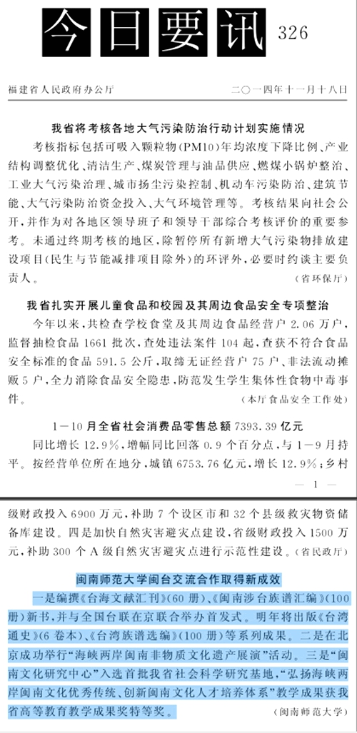 11月18日,省政府办公厅《今日要讯》第326期刊登我校闽南文化新成效。现转载如下: