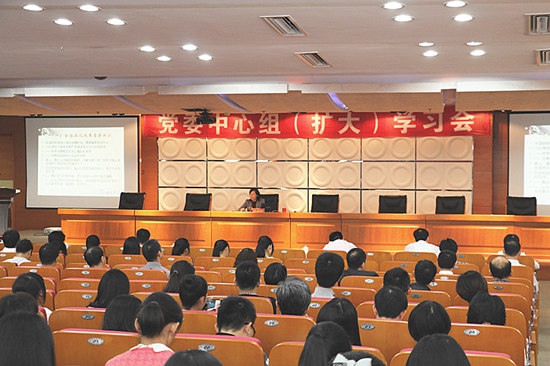 为深入学习贯彻党的十八届四中全会精神,进一步提高依法治校的水平,11月11日上午,我校在逸夫图书馆五楼报告厅召开党委中心组(扩大)学习会。全体在家校领导、全校副科级以上干部、学校各民主党派负责人、辅导员、法学院及马克思主义学院全体教师及专业学生代表共400余人参加会议。会议由校党委书记林晓峰主持。