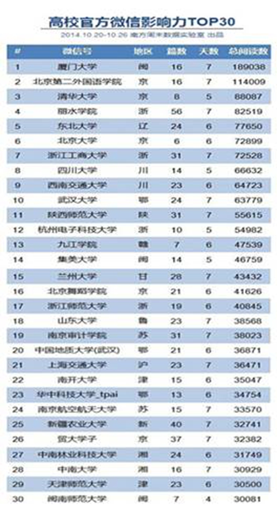 南方周末数据实验室出品的“中国高校微信排行榜”(10.20—10.26)榜单于10月31日发布。“闽南师范大学”微信公众号(微信号:mnnu01)首次打榜,推送的《闽师十大校花|有你认识的那个她吗?》以阅读量27505的阅读数名列高校校园媒体阅读量排行榜第7名。同时,我校官方微信平台名列该期全国高校官方微信影响力周榜第30名,在福建省高校排名第3。