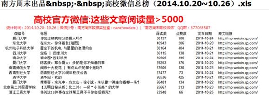 “中国高校微信排行榜”是南方周末新近推出的新媒体项目,该榜单统计全国208所省属重点以上的高校,每周对其官方微信运营数据进行统计分析,为读者提供有价值的数据参考。南方周末数据实验室每周收集全国各大高校微信推送的后台反馈数据,以真实的数据反映各大高校微信平台推送文章的质量和受欢迎程度,也是广大粉丝对各高校文化魅力的认可。