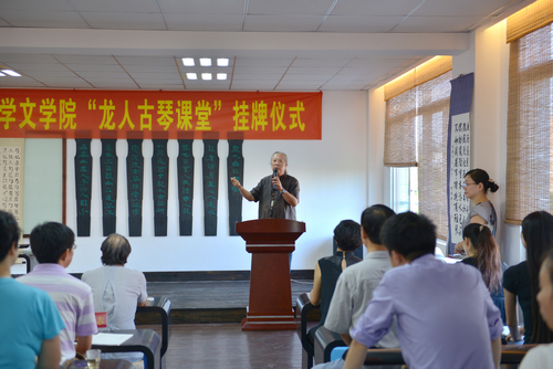 9月17日下午,我校文学院在博文楼古琴教室设立龙人古琴课堂,中国龙人古琴文化村村长谢建东、龙人古琴艺术总监张锦冰、中国琴会副会长杨青、著名古琴家乔珊、笛箫演奏家郑济民等琴师名匠,我校副校长肖庆伟、校相关部处领导及文学院领导老师出席了挂牌仪式。中国龙人古琴谢建东董事长为文学院古琴课堂授琴。