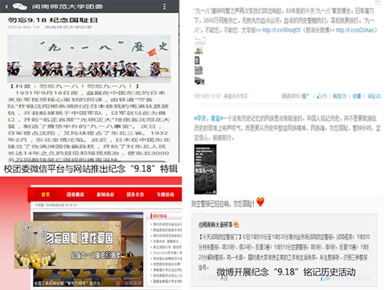 闽南师范大学团委的微信公众平台推送“九一八”特辑微信报,向同学们重述83年前这片华夏大地所遭受的辛酸与屈辱,悼念为国抛头颅洒热血的英雄;校团委网站上也做出了“勿忘国耻 理性爱国”的宣传视窗,警示大家要痛定思痛、勿忘国耻。由校青年宣传中心于微博发出的 “九一八”纪念长微博引起广泛关注,同学们纷纷在微博上转发和评论,同时表示“九一八”事变,是血泪换来的教训,因此不能忘,也不敢忘,不能做没有历史的民族。另外,校社联的漳州革命历史板块展示、“铭记历史,勿忘国耻”横幅签名活动同样吸引了大批的学生的参与,大家都自发的在纪念横幅上留下自己的名字,并驻足学习漳州革命史。
