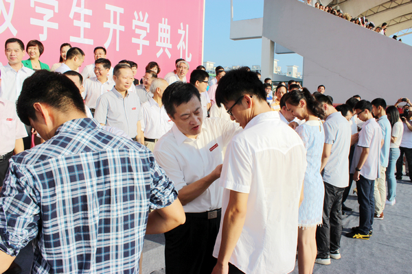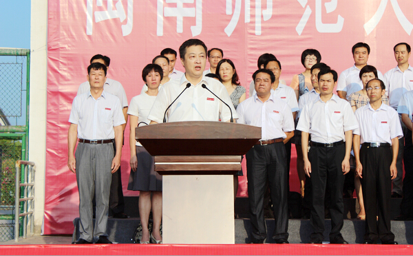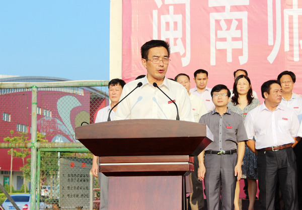 雄壮的国歌拉开了典礼的序幕,也拉开了2014级新生大学生涯的序幕。校党委书记林晓峰在会上发表热情洋溢的致辞。他代表全校师生员工对新同学的到来表示热烈的欢迎。林晓峰说,今天的开学典礼是各位新生大学生活中非常重要的一个仪式,也是闽南师大具有纪念意义的日子,今天的心情特别好,新老校友在这里欢聚一堂。在同学们开始新的学习生活之际,他寄希望于新同学们要把时间用在求学立业上,不断汲取知识,攀登学术高峰;要把时间用在锻炼身心上,锻造强健体魄,磨练坚强意志;要把时间用在提升修养上,知规范、懂礼仪,陶冶高尚情操;要把时间用在社会实践中,积极参加志愿服务活动,服务社会、帮助他人、提升自我。他还讲到,感恩,是师大的光荣传统,也是我们富有特色的校园文化。 “以生为本”是师大长期坚持的办学理念,我们将努力为同学们成长、成才创造优越的环境、提供优质的服务。