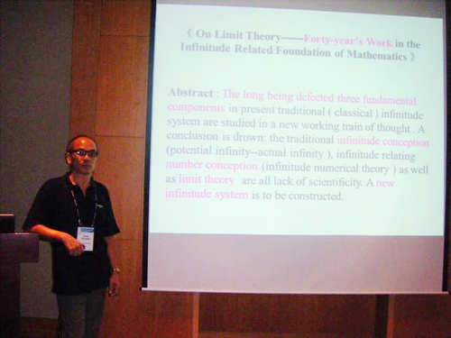 8月12日--8月21日,我校致公党主委欧阳耿副教授赴韩国首尔参加第27届世界数学家大会,并在“逻辑与基础”专题分会场上宣读了两篇论文:《论“极限论”----- 与“无穷”相关的数学基础研究四十年》和《芝诺悖论,贝克莱悖论和罗素悖论“三胞胎”悬案的解决-----与“无穷”相关的数学基础的革命》。欧阳副教授论文中新的研究思路、所涉及的基础理论以及相关的研究工作引起到会数学家的极大的兴趣。与会数学家一致认为数学哲学和数学基础理论研究很重要、但一直是个薄弱的环节,应该加强、应该努力、应该合作。