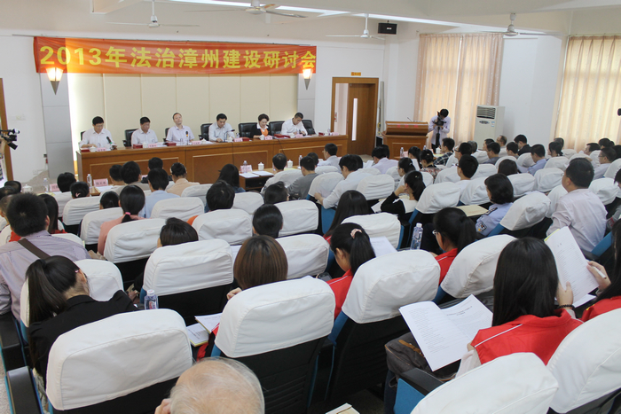 11月12日,由漳州市法学会、闽南师大政治法律系、法治漳州研究中心共同举办的2013年“法治漳州”建设研讨会在校逸夫楼三楼梯形会议室召开。来自漳州市法学会各专业研究会、市直政法各部门、各县(市、区)法学会以及我校政法系专家学者共计90余人围绕着“法治漳州建设的理论与实务研究”共同进行了热烈的探讨。本次研讨会由市政法委常务副书记、综治办常务副主任刘南辉主持。市政法委、中级人民法院、人民检察院、公安局、司法局的相关领导以及我校副校长蒋一婷、政法系副主任何东平教授等出席了本次会议。