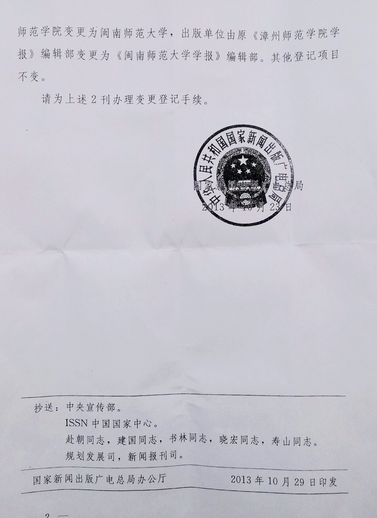近日,国家新闻出版广电总局下发新出审字[2013]1324号文,同意《漳州师范学院学报(哲学社会科学版)》和《漳州师范学院学报(自然科学版)》更名及变更主管主办和出版单位。