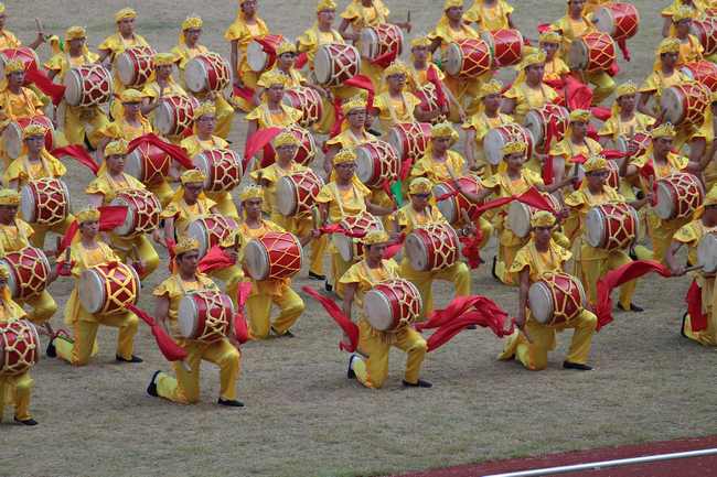 开幕式的文艺表演现场,我校大鼓凉伞队带来的节目——“鼓伞飞扬”,以磅礴的气势,精彩的表演,在开幕式上留下浓墨重彩的一笔。在露天体育场上,伴随着音乐的节奏,600多名演员,排列有致。男生手持鼓槌,鼓声阵阵,舞姿粗犷豪放,动作矫健潇洒;女生手持凉伞,踩着鼓点,翩翩起舞。表演队员们在振奋人心的乐声中迅速形成表演方阵,和着隆隆鼓声,队伍变换有序,整齐划一,伞鼓流韵,美轮美奂。场面壮观,气势恢弘,富有艺术震撼力的表演,赢得全场观众的阵阵掌声。最后,舞蹈以奥运五环状的编排队形结束演出,表演获得圆满成功。