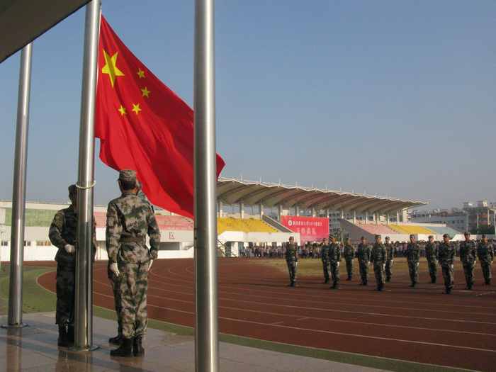 7点30分,开学典礼正式开始。国旗班的同学身着亮丽的军装,迈着严整的步伐,将五星红旗护送到升旗台上。在嘹亮雄壮的国歌声中,鲜艳的五星红旗冉冉上升,迎风飘扬。