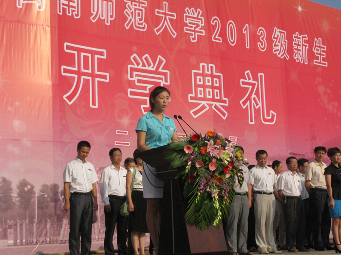 全体在家的校领导,各机关部门负责人,各院系党政领导出席典礼,全体政工干部、全体2013级学生任课教师及5600多名新生参加了典礼。