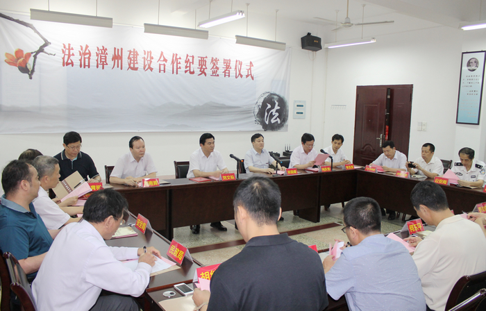 会上,钟发亮与刘南辉分别代表双方共同签署了“法治漳州建设合作纪要”。双方共同设立 “法治漳州研究中心”作为工作机构,在政策咨询、课题研究、理论探索、高校法学教师和政法干部的人才互动交流、卓越法律人才培养等方面开展长期合作。