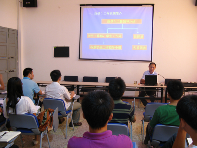 随后,学生处副处长黄伟东以“学生管理工作若干问题”为主题,用课件演示,分别就学生工作系统、学生管理工作主要内容、一些常见工作的难点、工作中应注意的问题等方面进行了详细介绍。他认为辅导员在高校中地位重要,身份特殊,要秉持以生为本、服务育人的工作理念,坚持依法管理、以情感人的管理原则,运用科学施教、与时俱进的工作方法,勤奋学习,踏实工作,公平公正对待每一位学生。