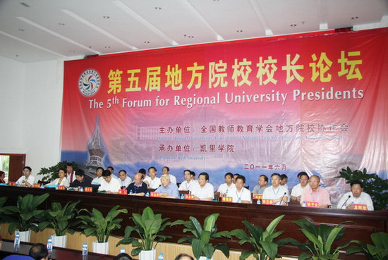 6月10—12日,来自全国25个省、市、自治区的101所地方院校的14名党委书记,52名院校长,39名党委副书记、副院校长共聚贵州凯里,参加由全国教师教育学会地方院校协作会主办、凯里学院承办的第五届地方院校校长论坛。教育部原副部长、中国高等教育学会会长周远清,教育部师范司副司长宋永刚以及贵州省人大、省教育厅、黔东南州委和政府、国家教育行政学院等领导和代表出席开幕式。高等教育出版社、中央教育科学研究所、《大学》杂志社等单位应邀参加会议。会议由 全国教师教育学会地方院校协作会副理事长、凯里学院院长曾羽主持。