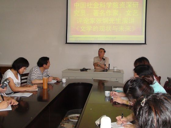 张教授首先提出文学走向边缘化的问题,然后针对“文学会消亡吗?”这个问题,张教授提出自己的观点:文学是在蓬勃发展的。主要从以下六个方面论述:一、文学作为语言艺术是艺术美的创造者,它能表现别的艺术不能表现的东西。文学创造美感,能满足人们的审美需要,具有无可取代性。二、文学能帮助了解历史,以《红楼梦》为例,指出文学作品含有丰富的历史细节,通过作品中的描述能更好的了解那个时代。三、文学是民族灵魂的塑造者。人类从野蛮到文明的进化有很大部分归功于文学。四、文学对政治能起伟大作用。五、文学还是一种经济财富的资源,文学具有审美价值,它必然就有了交换价值,可以作为商品进行交换。六、文学能培育人们的创造力。