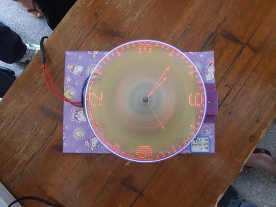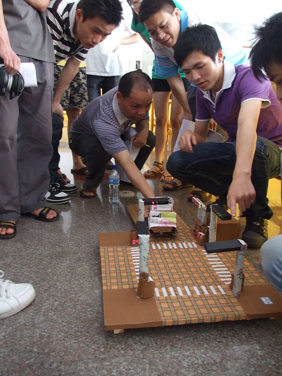 下午3时整,作品评选正式开始。评选过程中,参赛者就作品进行详细解说,并进行展示,每个作品由两名教师共同进行多方面客观评选,几个评选教师团队同时对作品进行评价,通过初选、复评多个步骤,评选出最具专业性、创新性的电子作品。同时还展出了我校在09年、10年全国大学生电子设计竞赛中的获奖作品,激励鼓舞了每一位参赛者与观众。与此同时,活动现场还设立了互动区与游戏区,大大活跃了现场气氛。最终,低年级组中的“模拟交通灯系统”出色应用了信号的提取与转换原理摘得桂冠。大三组作品中,“电子播放琴”,以单片机产生频率播放出音乐,通过键盘弹奏出音乐,以DS1302实现万年历,由程序配合液晶显示制作出4键无限添加菜单系统。作品“旋转时钟” 则是一种利用人眼的视觉惰性,让LED高速旋转形成LED屏,显示文字、数字及图形的LED屏显示的电子产品。两者难分伯仲,均获一等奖。