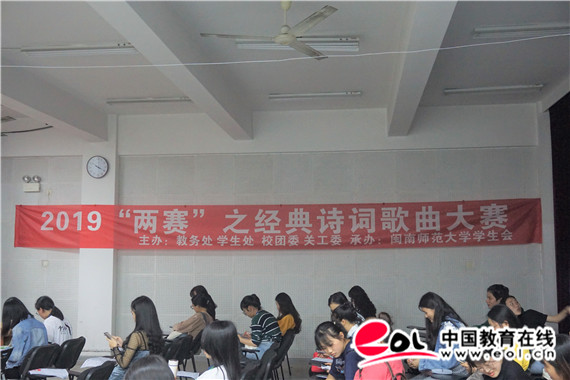中国教育在线讯 4月20日晚7时,闽南师范大学艺术学院合唱厅内传来阵阵充满古风古韵的歌声,合唱厅内灯光闪烁,座无虚席。闽南师范大学2019“两赛”之经典诗词歌曲大赛在此火热开赛。