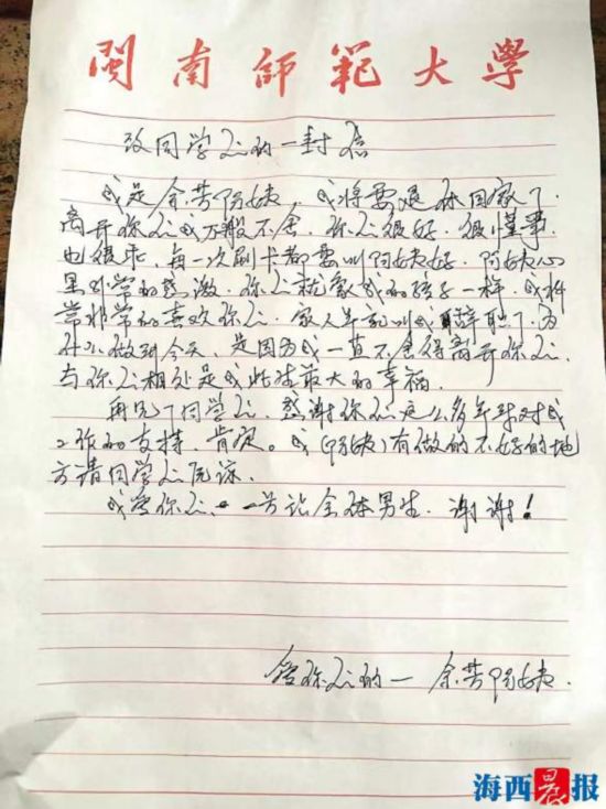与你们相处是我此生最大的幸福,再见了学生了……”近日,闽南师范大学宿管阿姨余芳即将退休,因舍不得和学生们分开,她写了一封告别信,不料却引起了学生们的热烈回应,大家纷纷给余芳送鲜花、塞纸条、录视频、感谢余芳这么多年来的悉心照顾。
