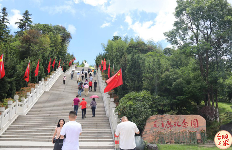 参观完古田会议会址,台湾教师一行来到毛主席纪念园。大家拾级而上,走过151级攀登台阶,来到毛主席雕像前。这是一座汉白玉毛泽东雕像,毛泽东雕像身穿风衣,左手拿着一顶圆舌帽,右手挥起,双目注视前方,凝望着这片土地。大家伫立仰视、庄严鞠躬、缓步绕行。