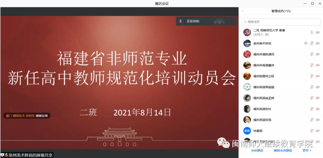 8月15日,由福建省教育厅主办,闽南师范大学承办的福建省2021年非师范专业新任高中教师规范化培训线上阶段正式开班,来自全省各地近400名非师范专业新任高中教师参加了此次培训。