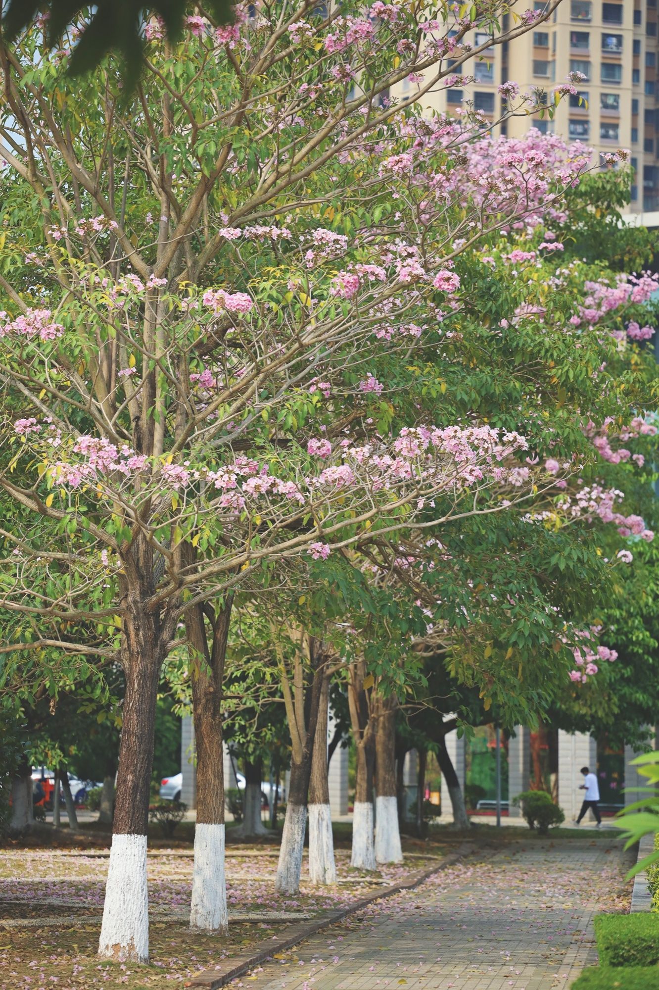 钻石广场上,粉色风铃木在悄悄向上生长,寻找春天的太阳
