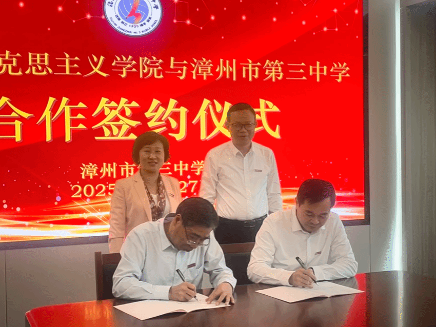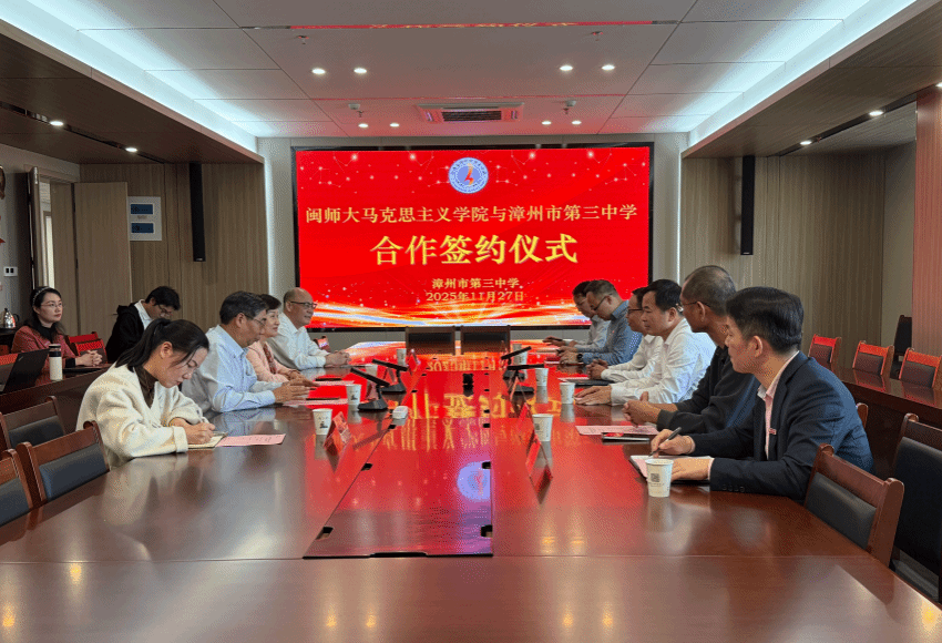 漳州新闻网讯(沈书伊 李倩)为深化校校协同合作,整合优质教育资源,11月27日下午,闽南师范大学马克思主义学院与漳州第三中学举行“教育协同发展战略”合作签约仪式。闽南师范大学马克思主义学院党委书记方琼、院长陈再生、副院长黄耀明、郑育琛教授,漳州三中校长黄志勇、党总支书记庄清寿及该校部分教师代表共同出席仪式。