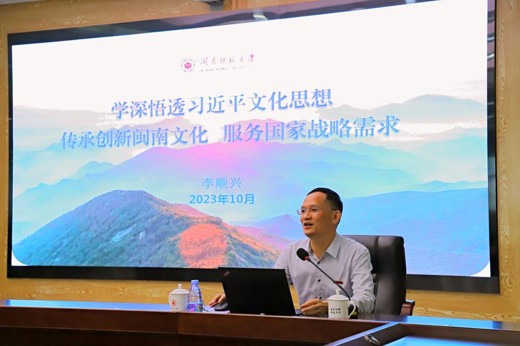 为深入学习宣传贯彻习近平文化思想,10月27日上午,校长李顺兴以《学深悟透习近平文化思想 传承创新闽南文化服务国家战略需求》为题,为我校2023级文科研究生新生、部分闽南文化卓越班本科生作形势政策报告。