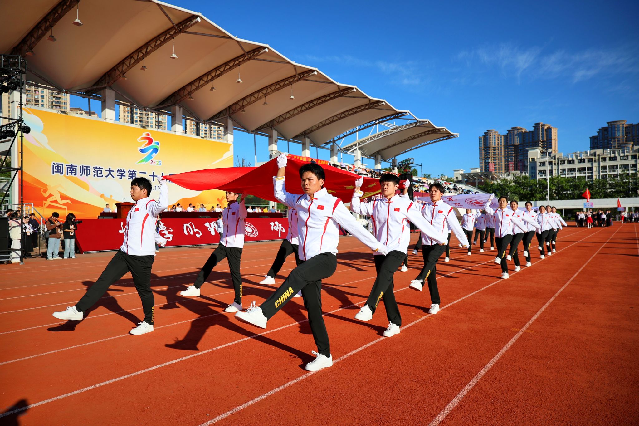开幕式上,五星红旗冉冉升起,各学院方阵步伐铿锵、口号嘹亮,展现着闽南师大学子的蓬勃朝气。运动员代表张中元与裁判员代表江叶分别庄严宣誓,承诺以拼搏之姿和公正之尺护航赛事。