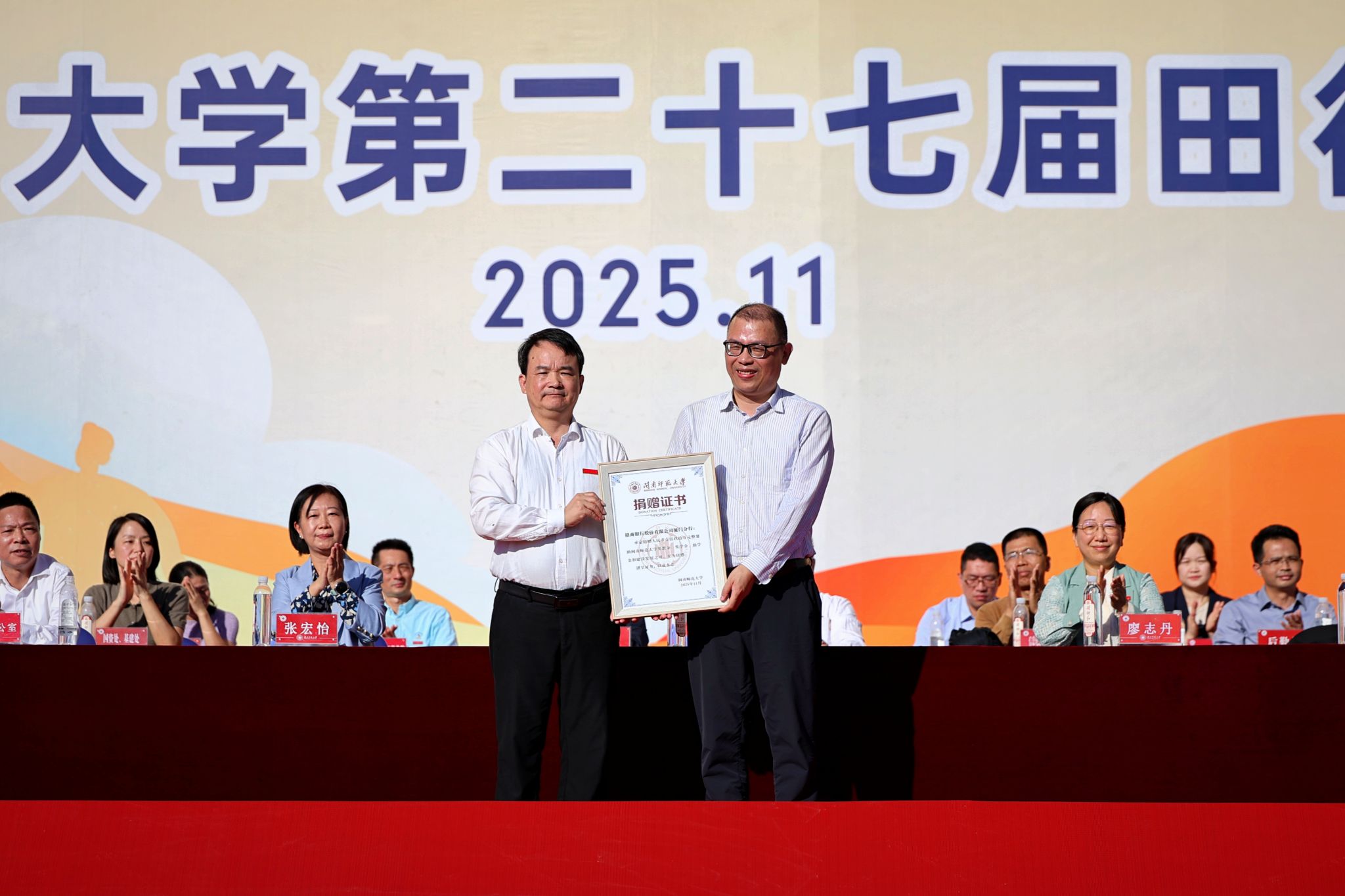 特别值得一提的是,招商银行股份有限公司厦门分行在开幕式上向学校捐赠190万元,用于设立奖教金、奖学金、助学金,助力学校办学事业提质升级。张龙海为其颁发捐赠证书,这份支持不仅为赛事增添温暖底色,更彰显了校企协同育人的责任担当。