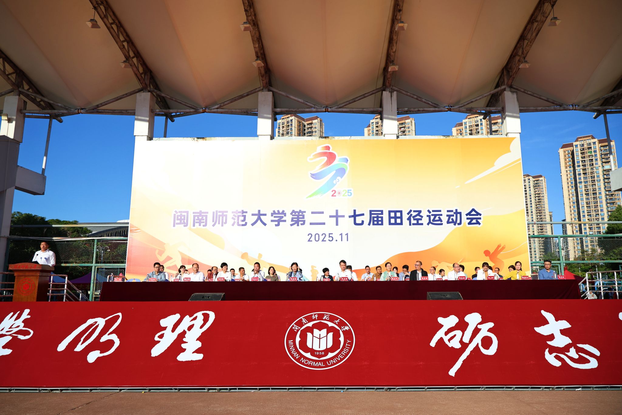 张宏怡在开幕式上致辞。她表示,近年来,学校高度重视发展校园体育,始终坚持五育并举,深化体育教育教学改革,持续推动人才培养与学科发展同频共振,强化特色项目建设,打造学校鲜明品牌,积极探索“体育下乡”“社区体育”等创新形式,为培养具有社会责任感和实践能力的新时代体育人才奠定了坚实基础。希望全体运动员弘扬中华体育精神和奥林匹克精神,挥洒汗水、勇攀高峰、绽放风采,共享运动带来的激情与快乐,共筑友谊与进步的桥梁;希望全体裁判人员严守公平公正准则,尺度统一,精准执裁;希望全体赛会工作人员全方位做好各项服务保障工作,用实绩充分展现闽南师大人的良好风貌和独特气质,为推动学校更高质量发展注入更多的蓬勃朝气和澎湃动力!