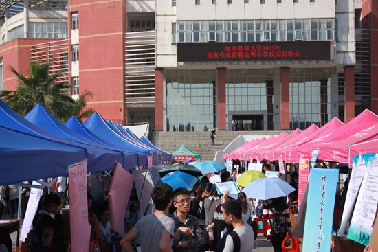 4月16日,闽南师范大学2015年校友企业招聘会暨春季校园招聘会在弦歌广场举行。本次招聘会由招生就业处、校友办主办,校就业服务中心具体承办。