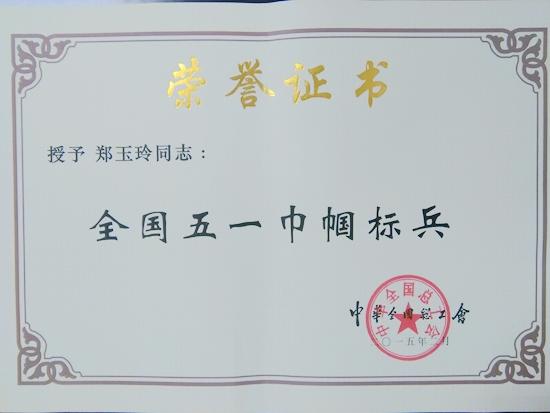 五一前夕,为表彰一批为国家经济建设和社会发展作出突出贡献的先进女职工集体和个人,根据《中华全国总工会关于表彰全国五一巾帼奖状(奖章)、全国五一巾帼标兵岗(标兵)的决定》,我校艺术学院郑玉玲教授荣获“全国五一巾帼标兵”荣誉称号。